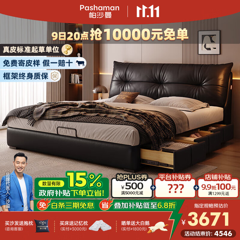 帕沙曼真皮床主卧高端大气软包床1米8双人床意式极简储物床箱体床8325CP 【榉木排骨架】单床+床垫#Z0012 1800*2000mm平移三抽结构