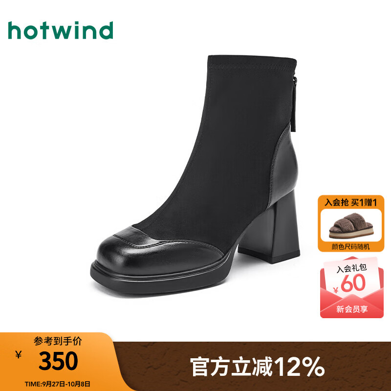 热风【商场同款】粗跟时装靴女2025年冬季新款方头显瘦短靴小个子女鞋 01黑色 36