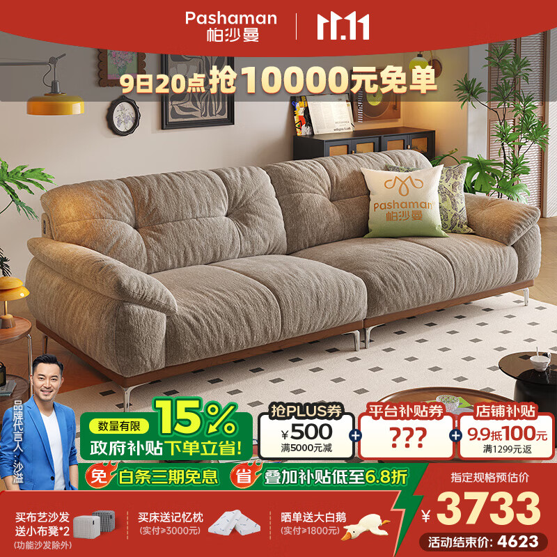 帕沙曼云朵布艺沙发小户型客厅新款复古风实木沙发雪尼尔可充电2786ZF 2.8米大双人位 【舒享版】 涟纹雪尼尔TY97