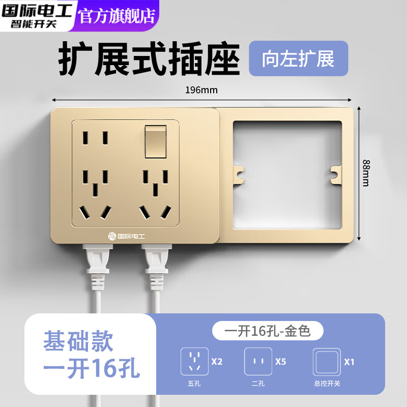 国际电工86型扩展式插座带开关延伸多功能拓展转换器多孔位插排插线接线板 金色空框架款【一开16孔-向左扩展】