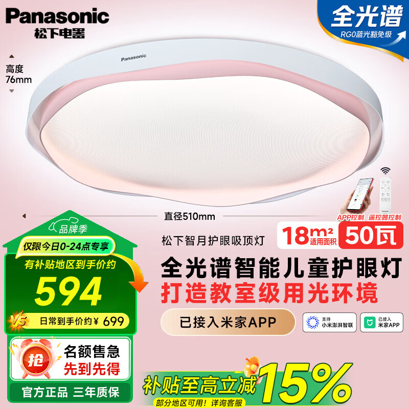 松下吸顶灯全光谱智能教育照明儿童房卧室灯 50W 2500lm 教室照明儿童房粉色