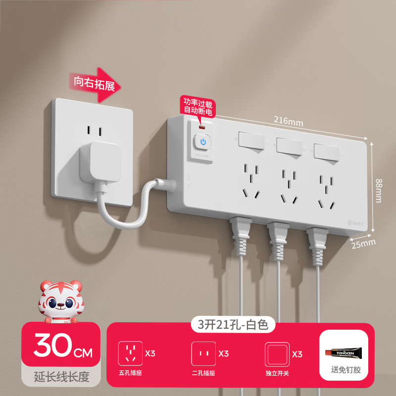 国际电工过载保护扩展插座一转多分控拓展家用带线厨房餐边柜带开关插线板 白色三开21孔向右扩展【带30cm电源线】
