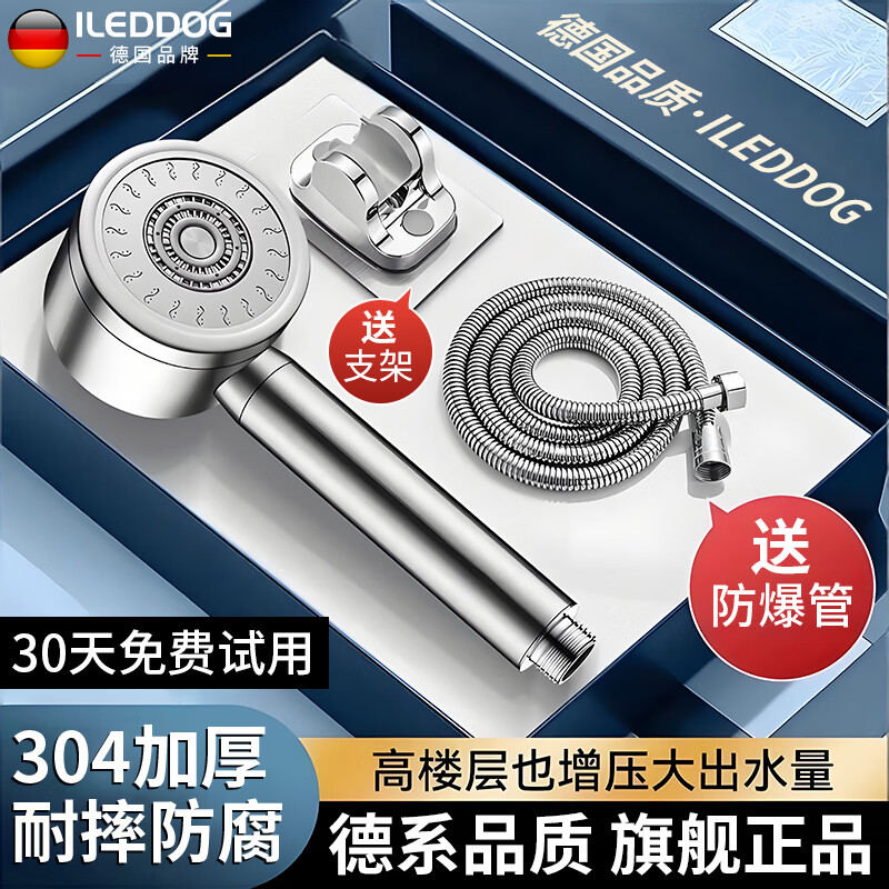 iLeddog【德国】淋浴增压花洒喷头带软管一套家用浴室全套洗澡手持莲蓬头 【钛钻色】旗舰304增压花洒三件套 真304不锈钢丨耐摔耐腐
