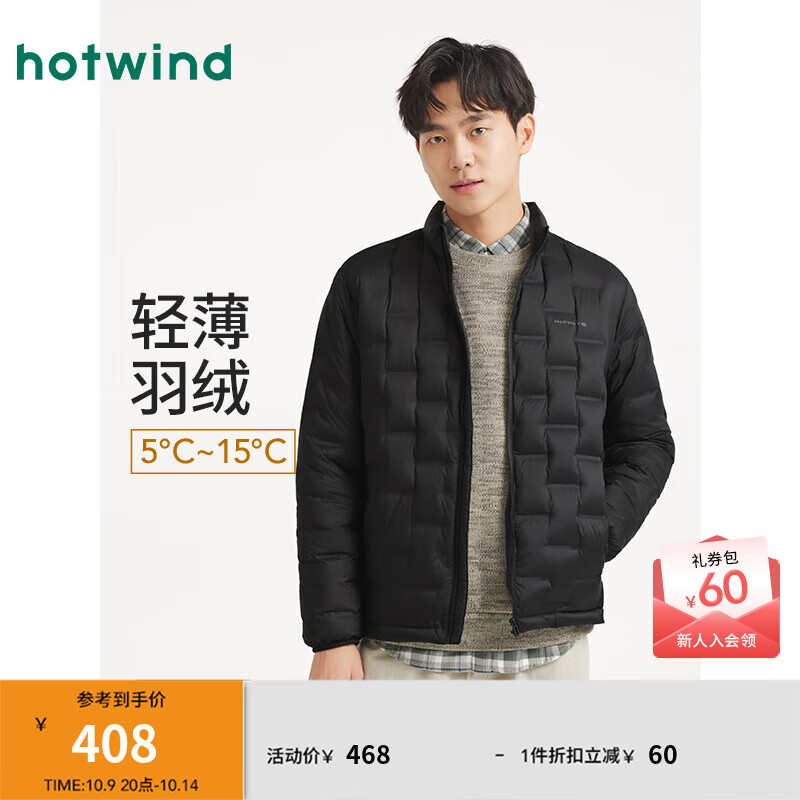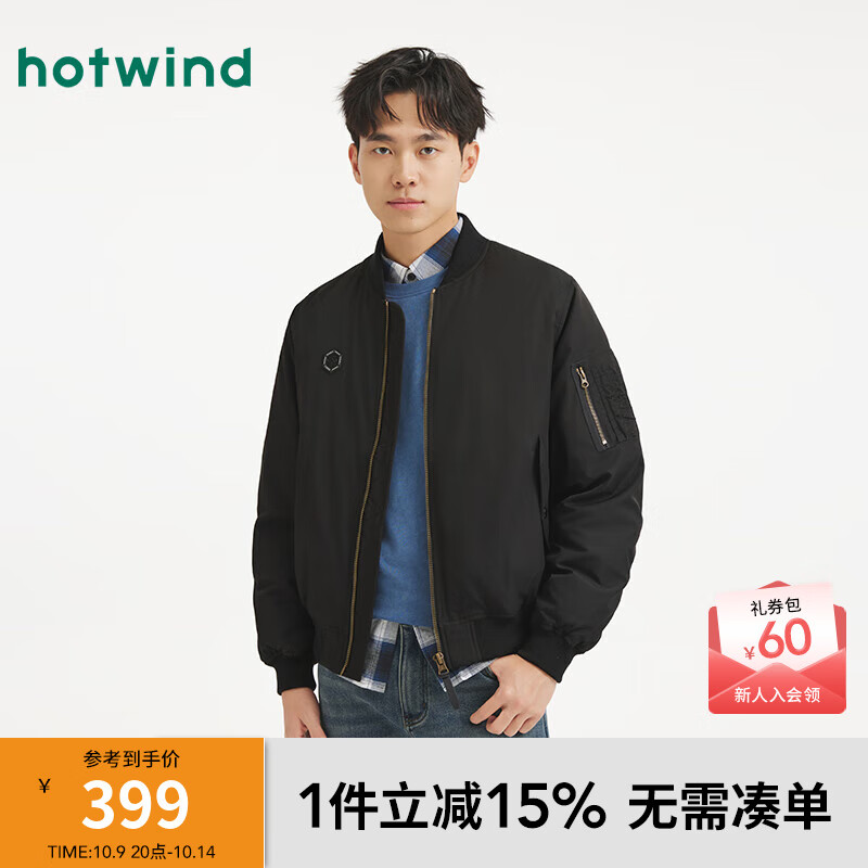 热风(Hotwind)男士羽绒服2025年冬季新款飞行员夹克羽绒服时尚轻薄羽绒外套 01黑色 S 充绒量68g