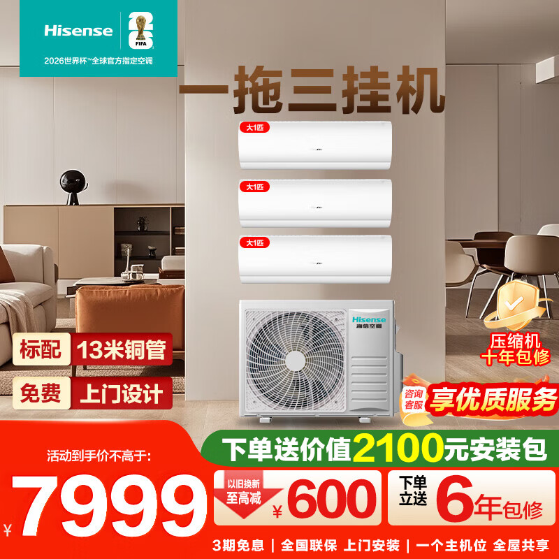 海信(Hisense)一拖三空调【2025新品】大1匹/大1.5匹挂机 变频节能 复式loft公寓卧室 4匹中央空调 换新补贴二 4匹 【包安装】带13米铜管大1匹*3 【包安装+送压缩机十年包修】