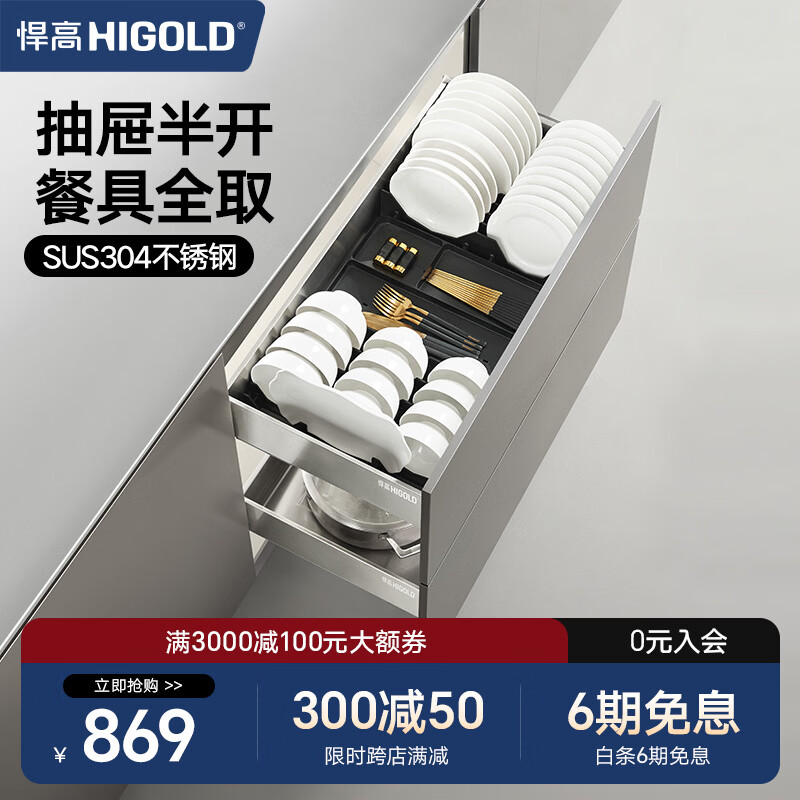 悍高(HIGOLD)厨房橱柜拉篮抽屉式304不锈钢碗碟拉篮碗架双层碗篮 900柜PDL2.0套装-可放鱼碟