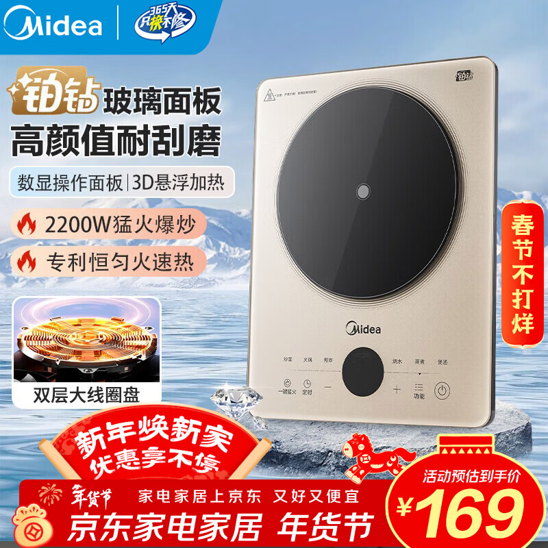 美的(Midea)家用电磁炉火锅炉 铂钻面板专利匀火加热 2200W大功率爆炒防水智能电陶炉MC-E22B21 【3D悬浮大火】