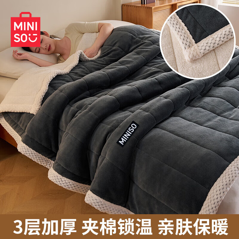 名创优品珊瑚绒毛毯三层冬季加厚加绒午休盖毯空调午睡毯办公室小毯子披肩 深灰+白【三层加厚保暖抗寒】 午睡毯:120*200cm
