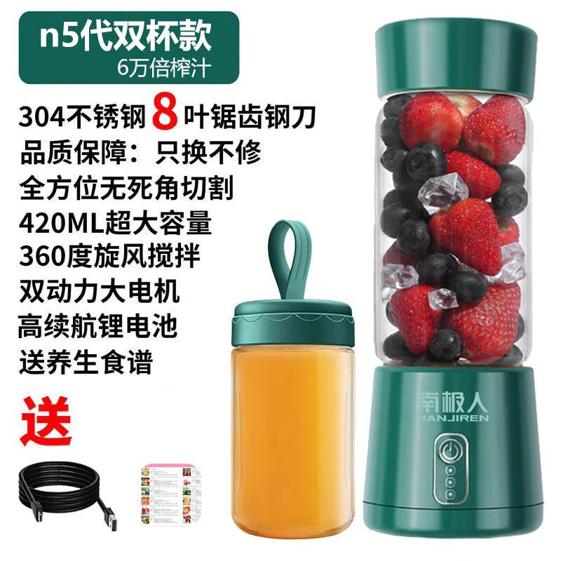 DEATKN蔬果榨汁机家用小型充电便携式炸果子学生榨汁神器炸果汁机 苍岭绿-24小时发货 n5双杯款【八叶刀双杯双盖-双动力】