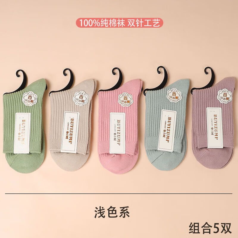 AILUKI100%百棉袜子女秋冬季纯色双针加厚中筒袜保暖纯棉休闲中长腰棉袜 5双装(浅色系) 均码(35-40码 百棉系列)