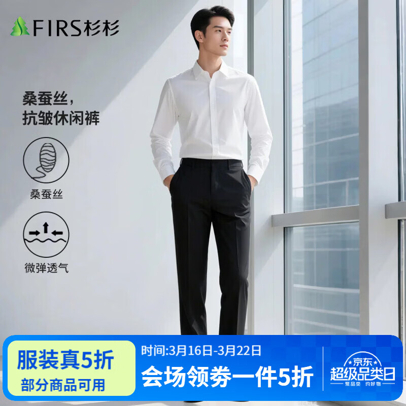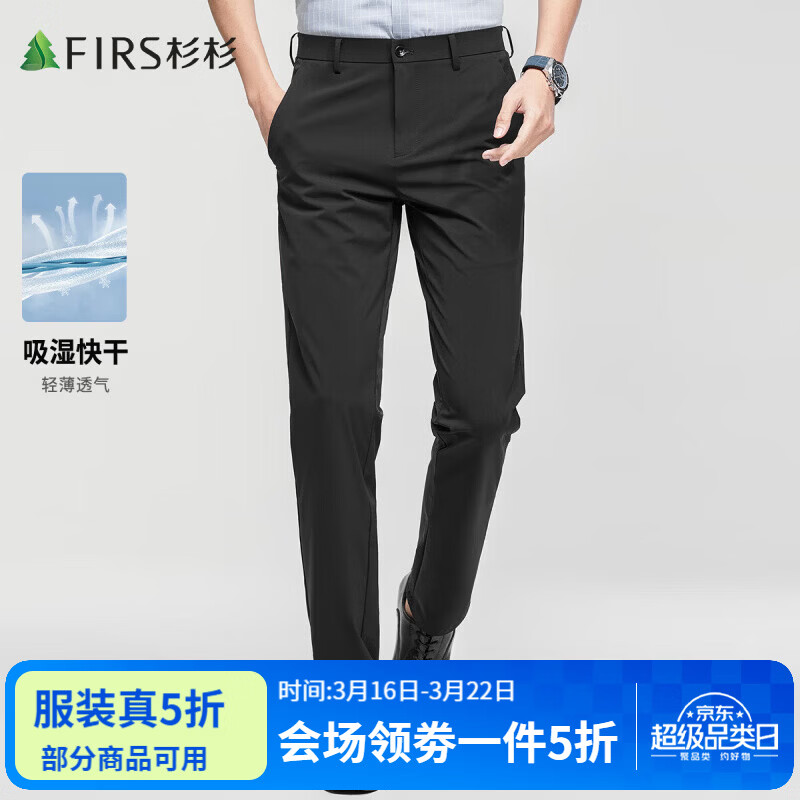 杉杉(FIRS)【锦氨弹力】休闲裤男吸湿透气轻薄合体直筒裤垂顺抗皱修身长裤男 黑色 L 175/84A(33)
