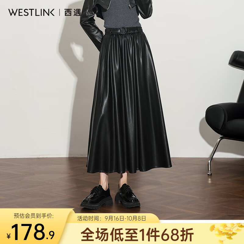 西遇复古优雅高端PU皮裙女2025秋季高腰显瘦百褶裙A字半身裙 黑色 S (26)
