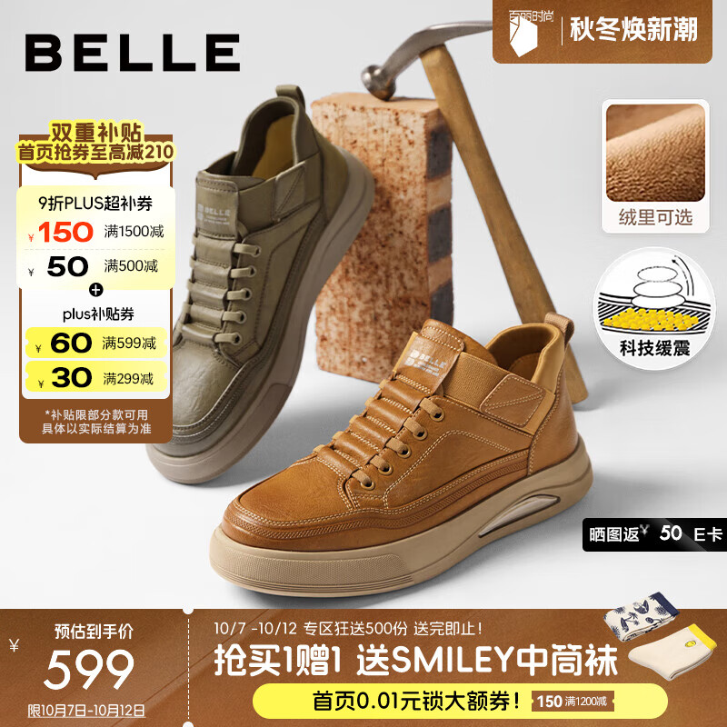 百丽(Belle)男鞋高帮休闲工装鞋2025冬季新款厚底套脚板鞋加绒D3MA8DM5预售 棕色(绒里) 42 (260mm)