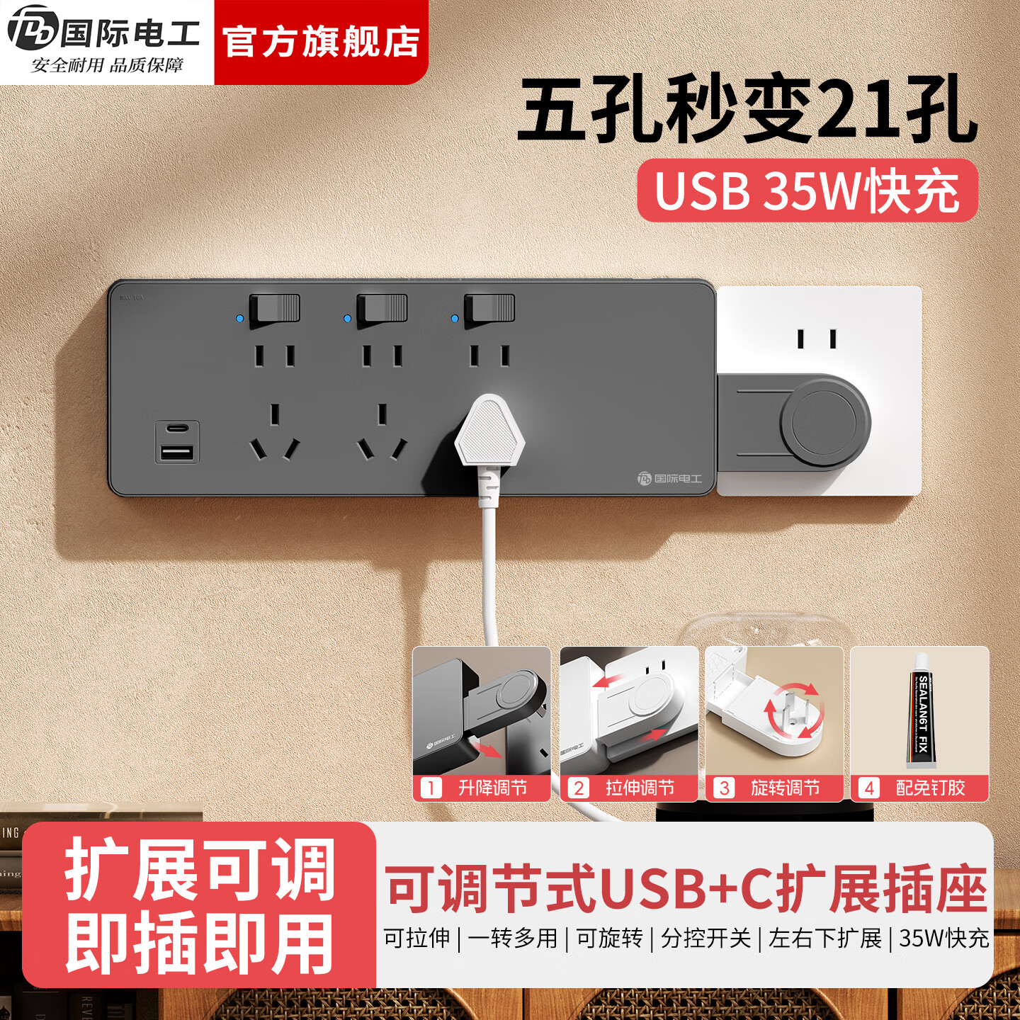 国际电工(FDD)直插式扩展插座家用厨房一转多孔位电源带开关拓展插排转换器插板 【35W快充款】三开21孔向左扩展 灰色