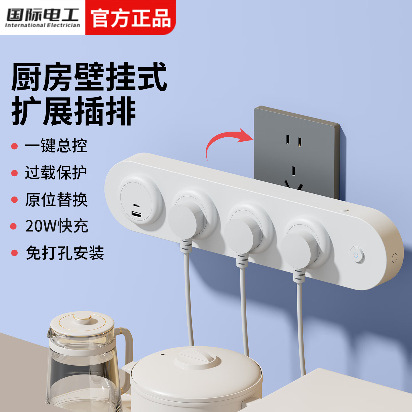 国际电工厨房挂壁式轨道插排家用扩展插座卧室墙壁原位替换USB快充插板 黑色四位五孔【一键控制】