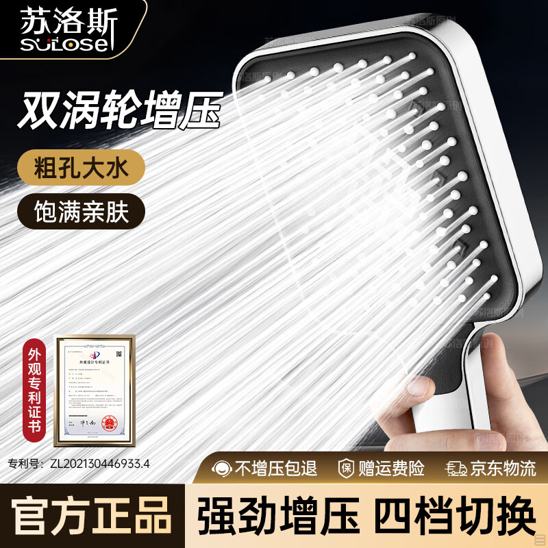 苏洛斯增压花洒淋浴喷头带软管套装浴室卫生间热水器洗澡手持加压莲蓬头 【方款电镀】空气增压丨四档出水切换 四分通用接口丨硅胶防堵出水孔