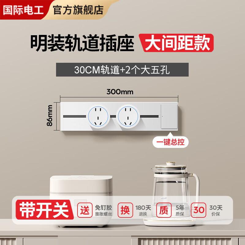 FDD国际电工明装轨道插座可移动滑轨扩展式面板86型插排电力厨房家用一键断电 【一键断电】30cm+2个五孔-雪白
