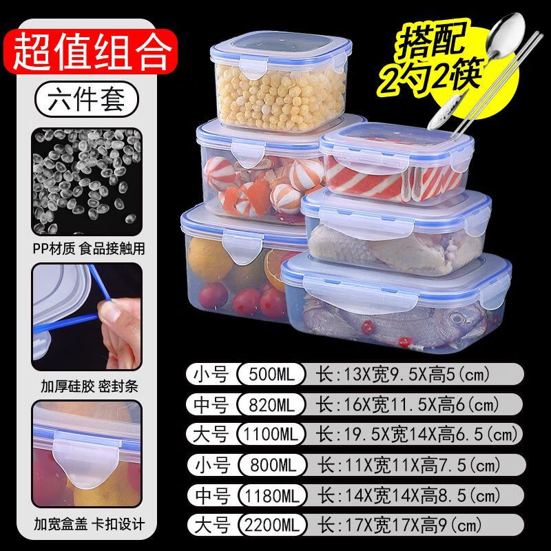 DEATKN微波炉透明塑料保鲜盒套装冰箱饭盒密封正长方形可加热食物便当盒 超值组合六件套:6个型号各1个【配勺筷*2】 【可微波炉加热/密封盖不漏水】食品级PP材质