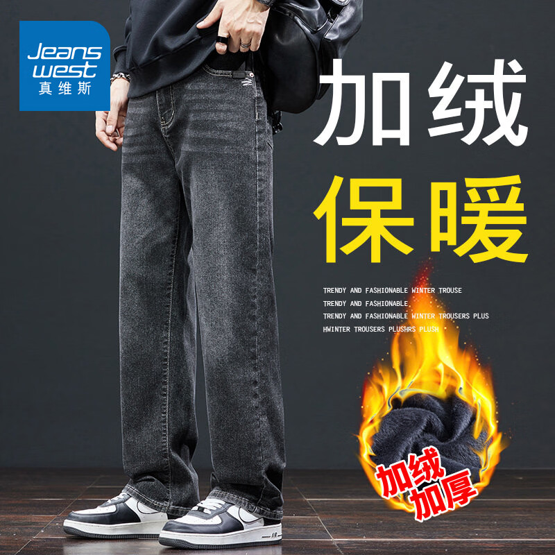 真维斯(Jeanswest)2026春夏新款加绒保暖弹力牛仔裤男士潮牌宽松垂感直筒休闲裤子 黑灰 28