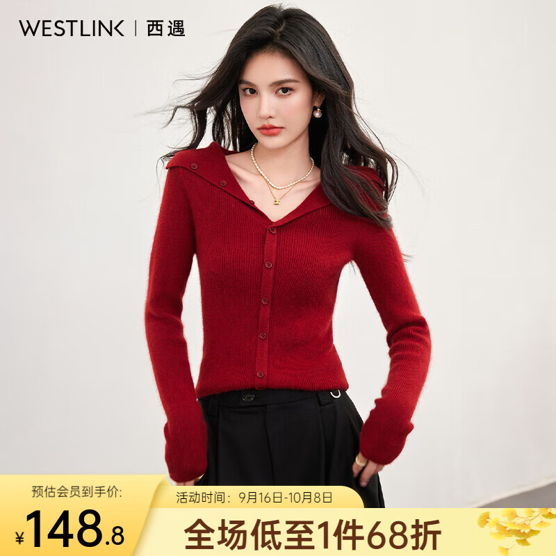 西遇红色针织开衫女2025年秋季新款设计感V领修身显瘦打底毛衣 红色 (预售15天) M (160)
