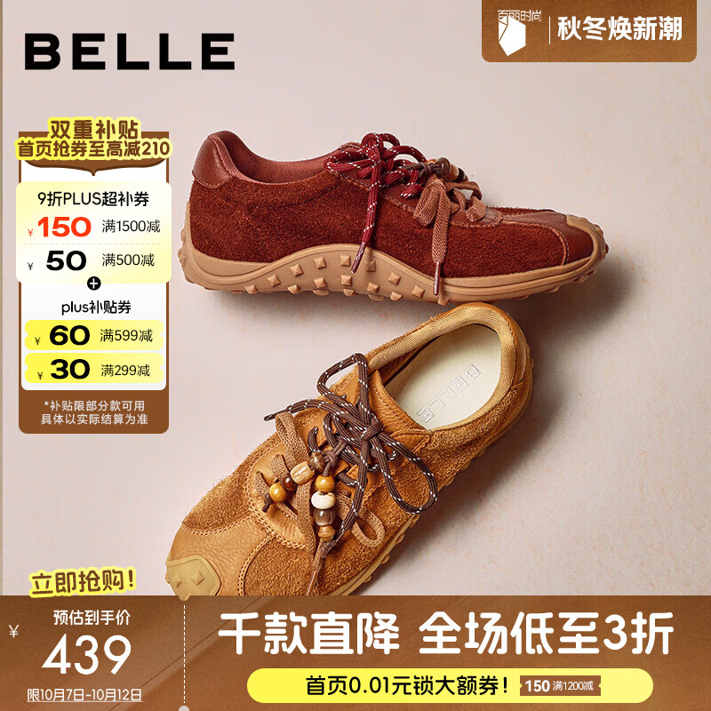 百丽(Belle)复古牛皮风德训鞋女25秋新双鞋带舒适薄底运动休闲鞋B2902CM5 红色 35