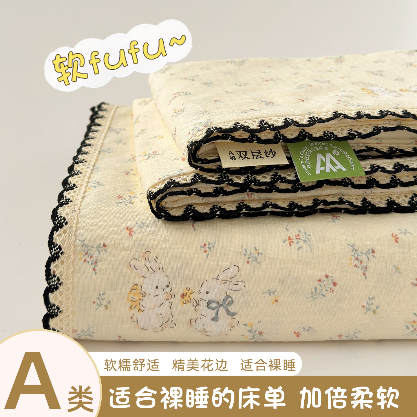 无印良品A类双层纱花边床单单件宿舍家用被单可裸睡床盖单双人床罩三件套 春日兔絮 【A类双层纱 亲肤裸睡】 200cm*230cm 单床单【1.5-1.8m床】