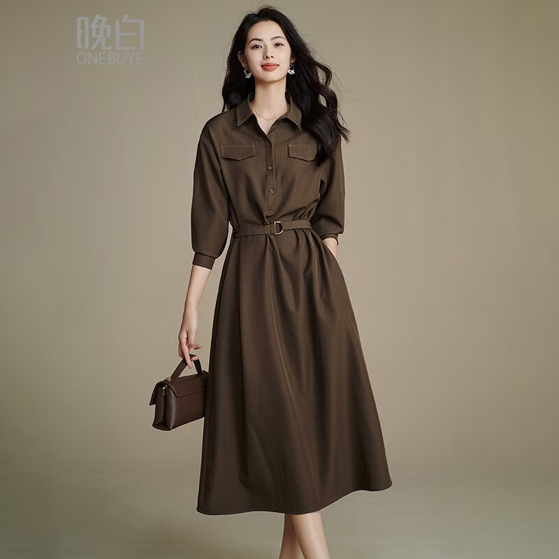 晚白【新品】2026春季收腰显瘦裙子优雅时尚百搭宽松大码长袖连衣裙 深咖色 XL