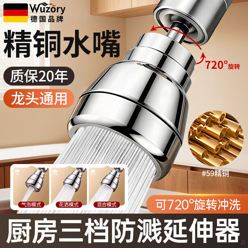 WUZORY【德国】水龙头延伸器万能转接头厨房防溅头万向可转换增压起泡器 【镜光银】万向三档+健康净铅 告别溅水丨720°任意旋转丨送全套配件