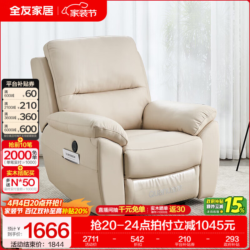 全友家居电动多功能真皮单人沙发躺椅客厅家用休闲懒人小沙发可睡觉 【头层牛皮|奶油杏】G电动皮单椅