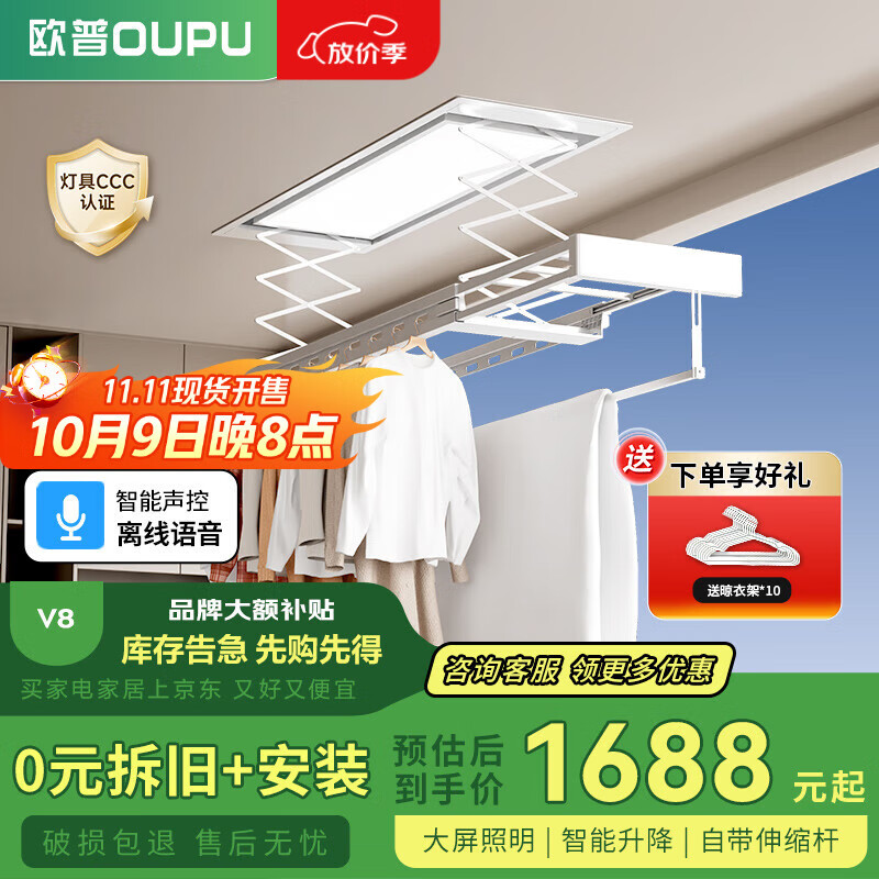 欧普(oupu)隐形晾衣架电动隐藏真零嵌入式升降智能大承重电动晾衣架 V8真零嵌-语音款