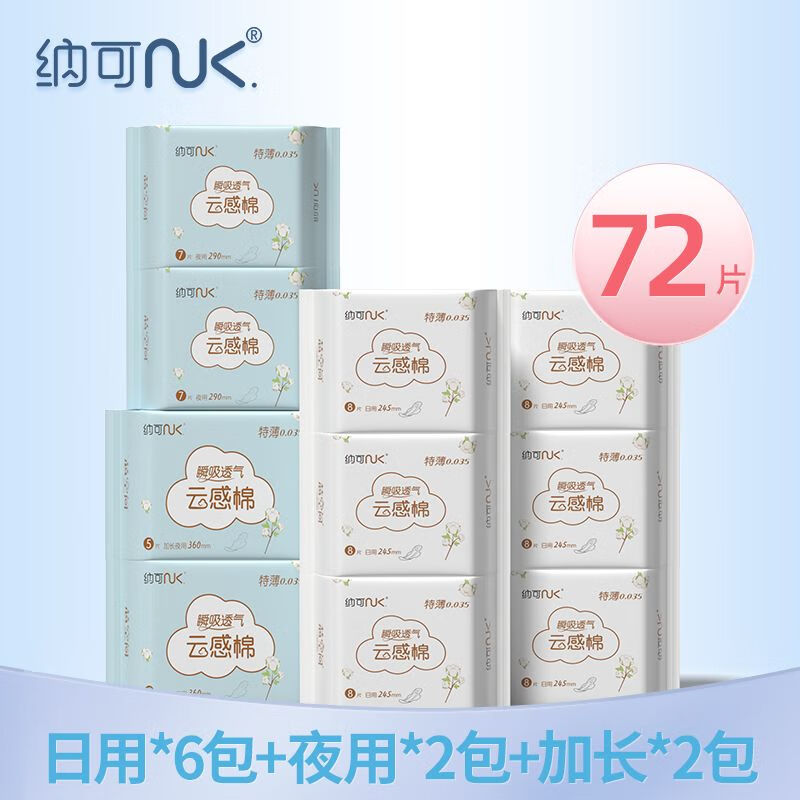 AILUKI纳可卫生巾日夜组合姨妈巾整箱批发超薄棉柔透气经期姨妈卫生巾女 6日2夜2加长(共72片)