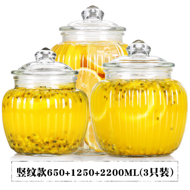 DEATKN德国密封罐玻璃储物罐子蜂蜜柠檬食品罐头瓶腌制罐小泡菜坛子带盖 竖纹款 【三件套】650+1250+2200