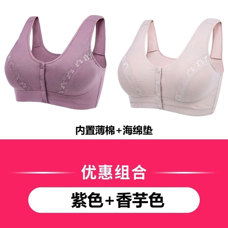 AILUKI无钢圈中老年妈妈文胸纯棉前开扣运动背心式内衣女收副乳中厚胸罩 紫色+香芋色【内置薄棉+海绵垫】 36码【建议70-85斤】
