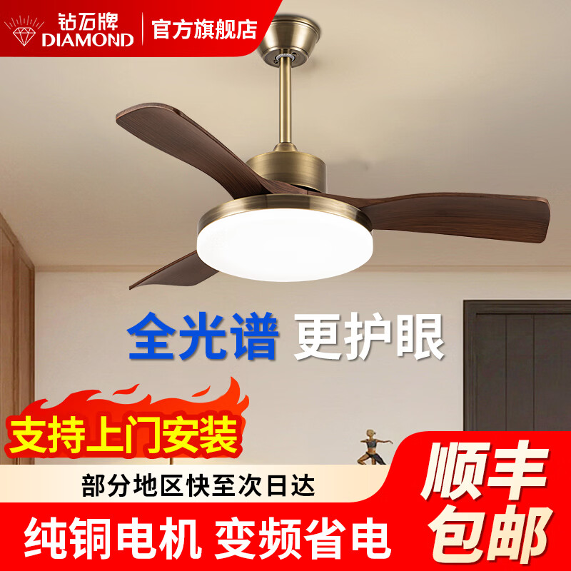 钻石牌风扇灯一体餐厅吊扇灯客厅吊灯带风扇卧室吸顶吊顶简约电扇灯具 42寸三叶古铜+黑胡桃双控-吊杆