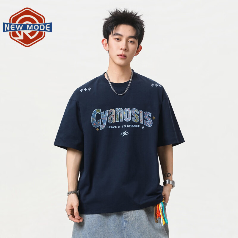 NEW OR MODE美式高街字母圆领短袖t恤男夏季潮牌纯棉重磅宽松情侣五分袖T恤衫 藏青色【高品质】 M 【建议90-110斤】