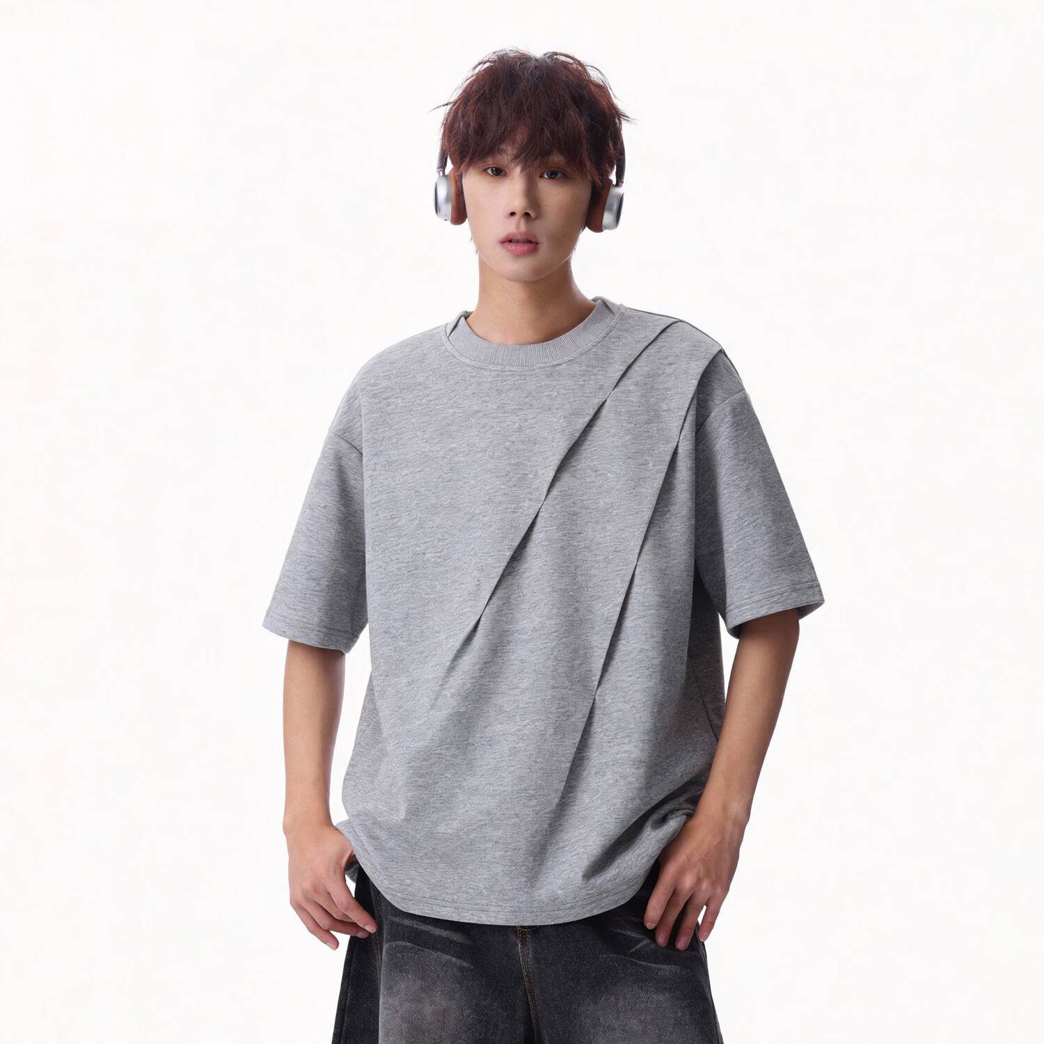 NEW OR MODE美式解构褶皱短袖t恤男夏季新款宽松大码设计感休闲半袖打底衫T恤 灰色【高品质】 M 【建议90-110斤】