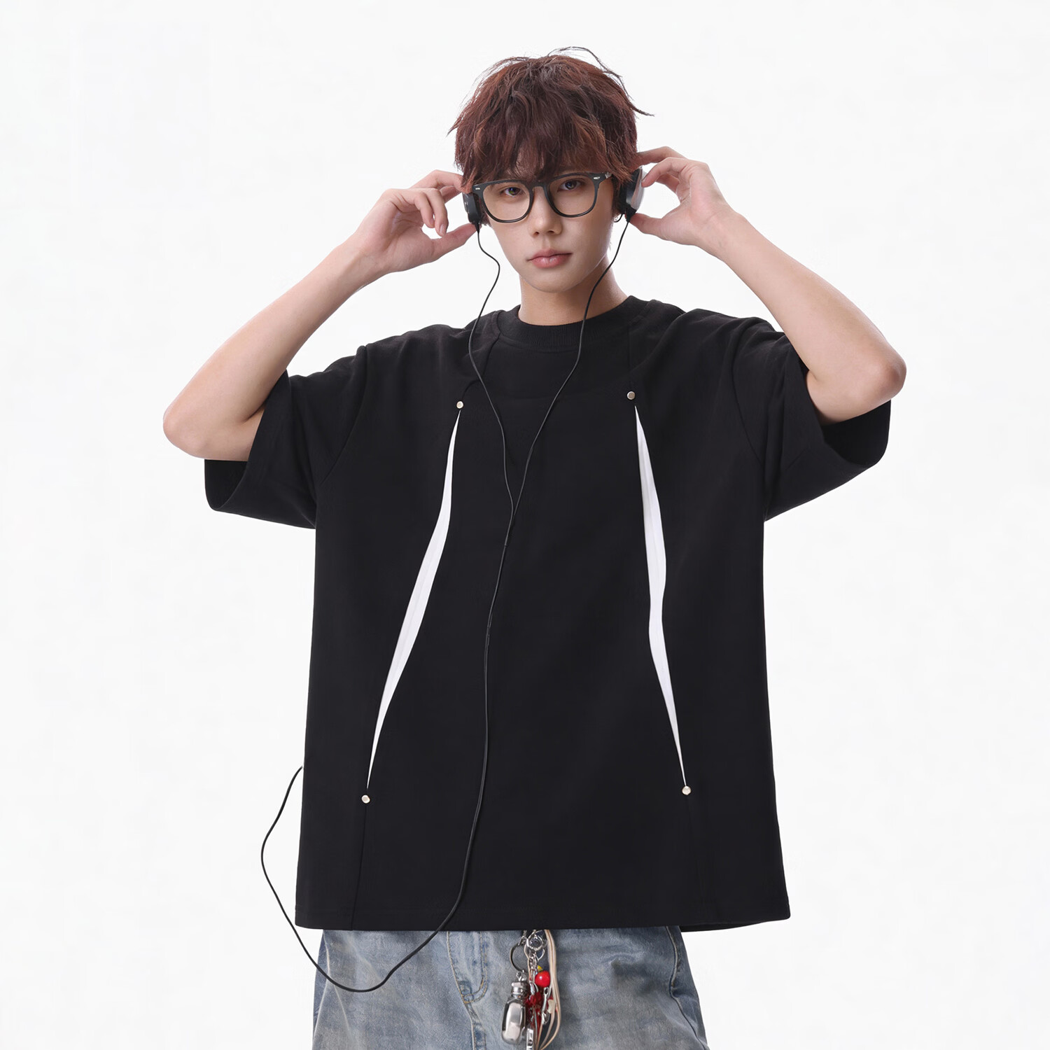 NEW OR MODE美式条纹拼接短袖t恤男夏季复古宽松休闲上衣潮牌百搭设计感半袖T 黑色【高品质】 M 【建议90-110斤】