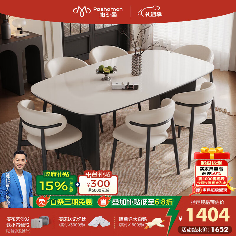 帕沙曼全托底板岩板餐桌椅组小户型家用复古奶油风马肚型长方形桌 6230Y 【亮光雪花白+全托底板】单餐桌 140cm *80cm*75cm