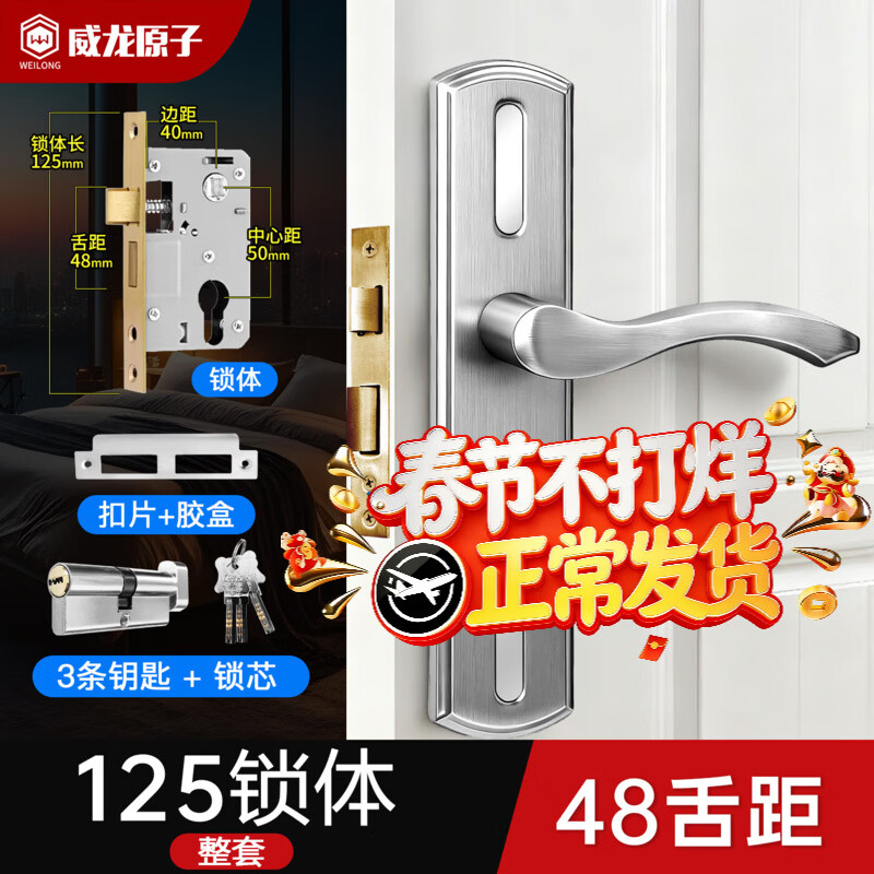 威龙原子卧室门锁家用通用型整套房间门锁木门锁把手卫生间厕所门锁 加厚不锈钢-整套-125锁体-48锁舌