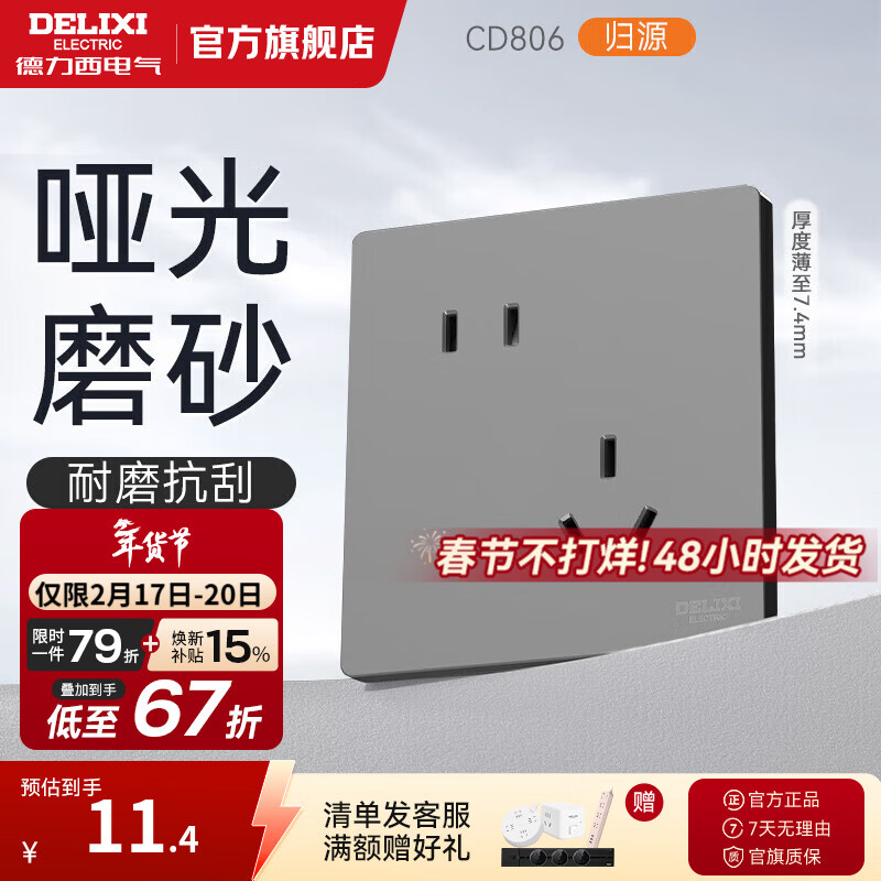 德力西(DELIXI)开关插座面板 哑光磨砂 86型墙壁电源插座 CD806星空灰 无框大板 五孔插座10A(斜)