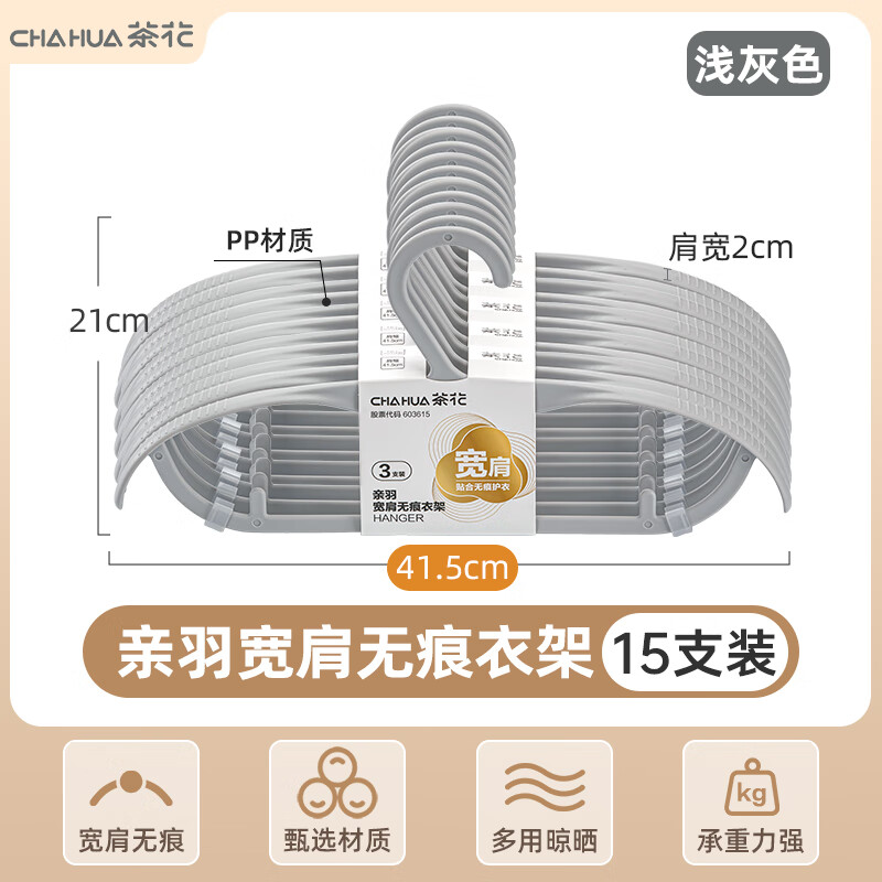 茶花亲羽宽肩无痕家用晒衣架挂钩架衣服撑子卧室挂衣晾衣撑塑料衣架 15个装【灰色】亲羽衣架#肩宽2cm