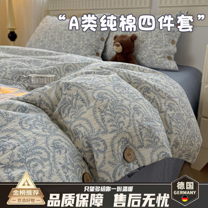 DEATKN德国床上四件套棉全棉2025新款被套被罩床单大学生宿舍磨毛三件套 青黛-【品质_可裸睡_越用越软】 床单款 1.8m床四件套:适合200X230被芯