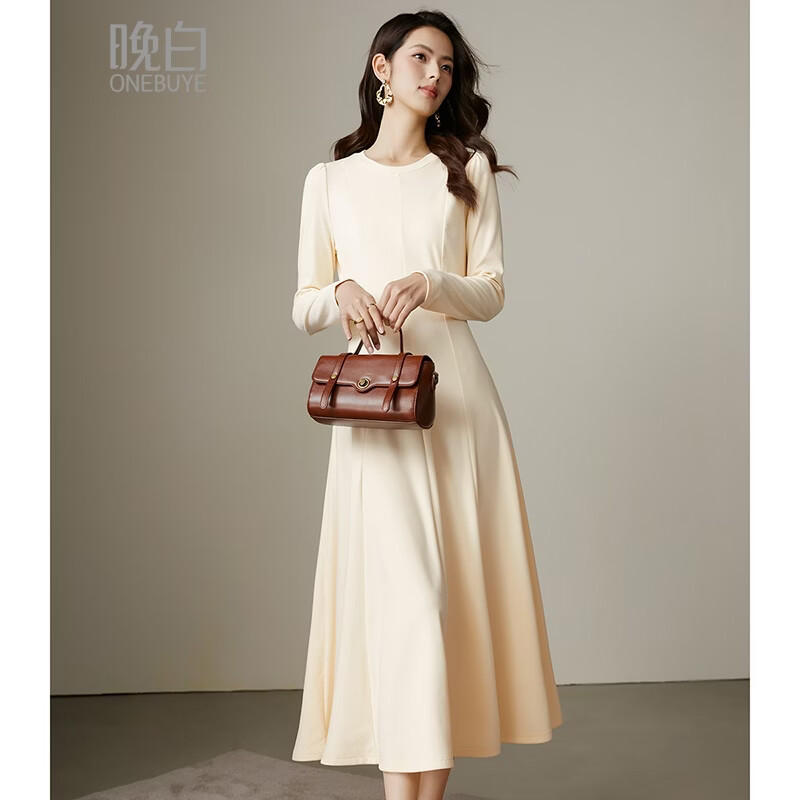 晚白【断码清仓】2026年春款时尚休闲裙子纯色收腰显瘦长袖连衣裙 米杏色 S