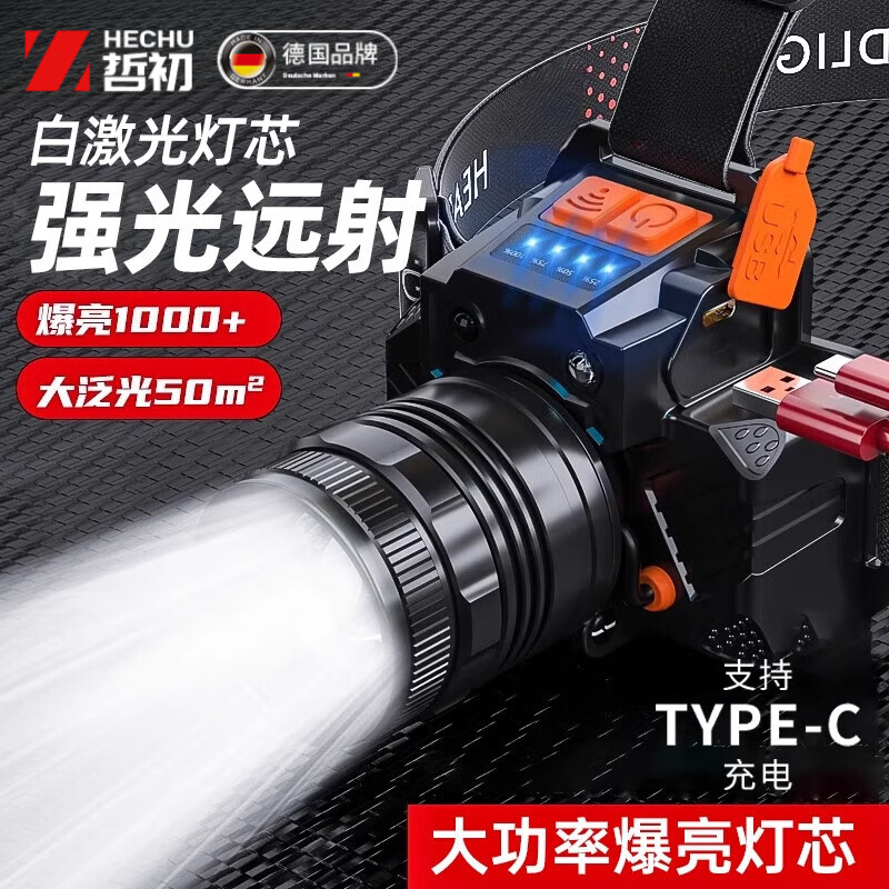 哲初德国头灯强光超长续航72小时50000w防水60小时头戴矿灯钓鱼军户外 【T82400白光-40小时】感应/电显/可充手机