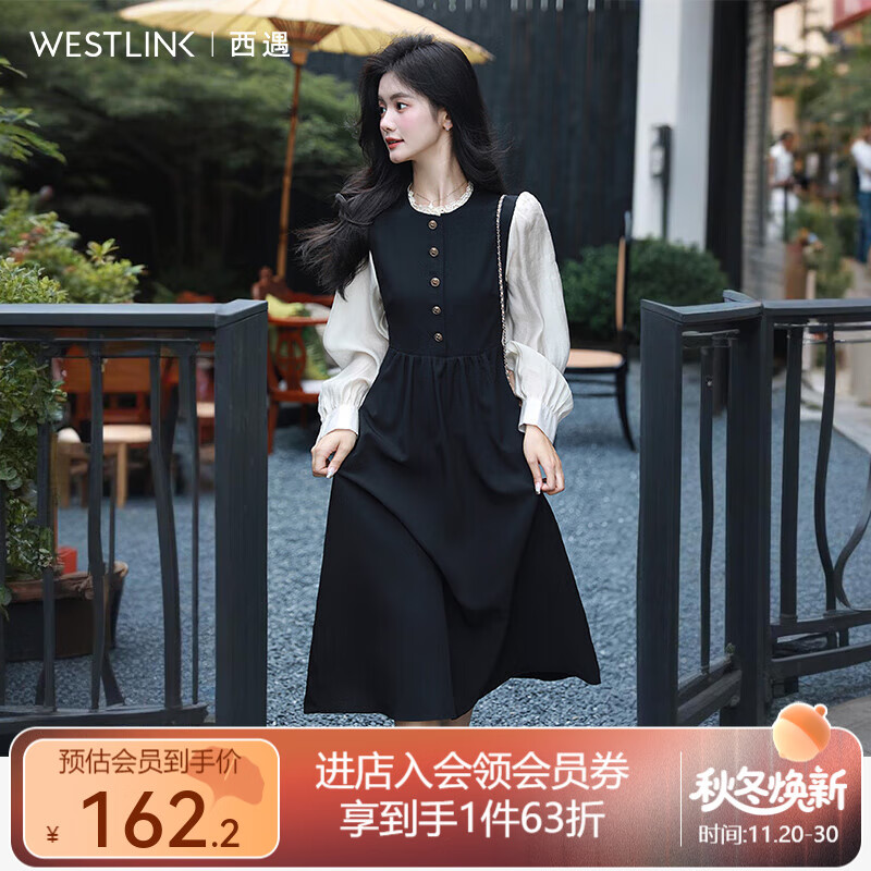 西遇法式黑色长袖连衣裙女2025年秋季新款小香风a字收腰中长裙 黑色 M (160)