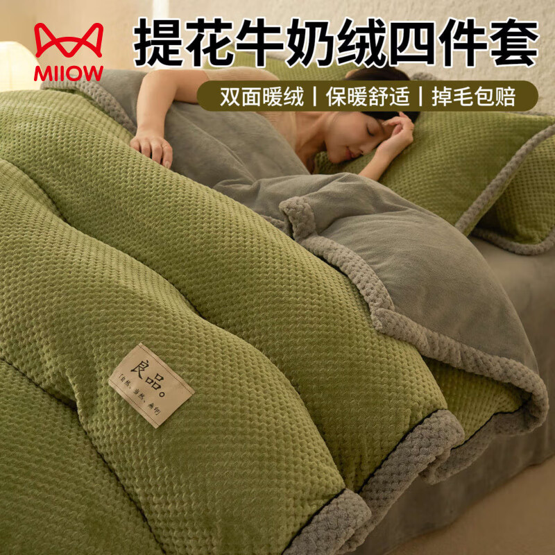 猫人(MiiOW)加厚牛奶绒提花床上四件套冬季法兰绒双面绒床单被套学生三件套 尚流-草绿 【加厚保暖】 1.5m 床单款 四件套-200*230cm被套