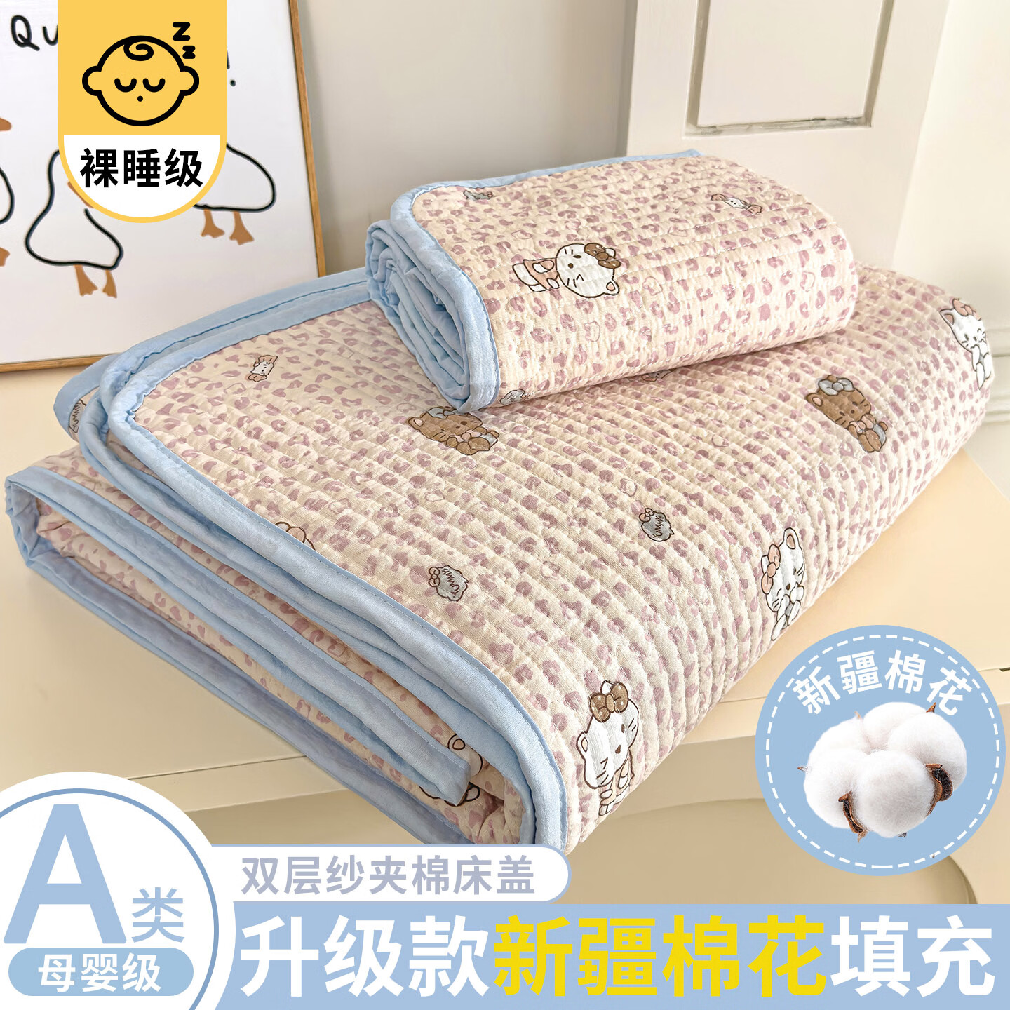 VJE云感双层纱全棉纯棉花床盖床单家用亲肤可水洗夹棉床垫被单枕套 豹纹猫咪-粉 90*200cm单床盖