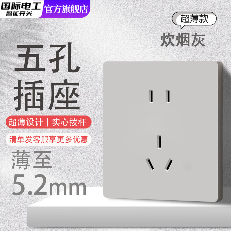 国际电工86型暗装墙壁超薄磨砂面板家用炊烟灰拨杆开关插座一开双控五孔 五孔插座