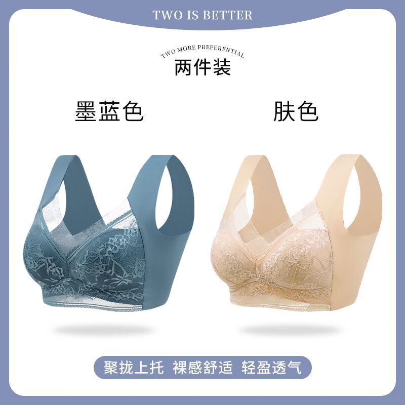 AILUKI买一送一女士内衣无钢圈抹胸聚拢防下垂收副乳胸罩蕾丝背心式文胸 【2件装】墨蓝色+肤色 L 【80-100斤】