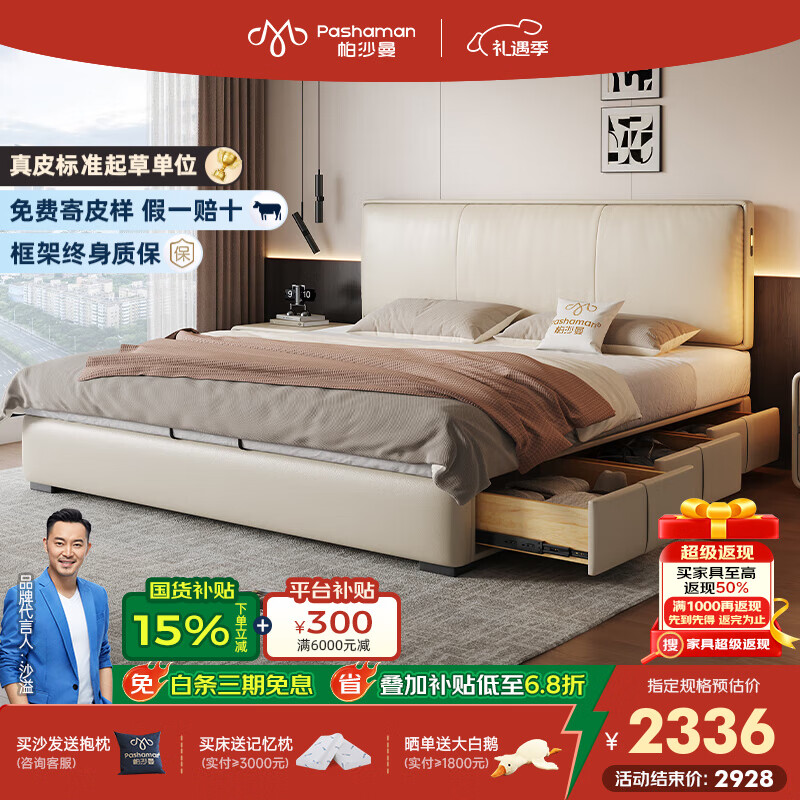 帕沙曼国货补贴真皮床1米8双人床卧室储物床超薄床头小户型单人床8402CP 【榉木整架排骨架】单床 框架结构1800mm*2000mm
